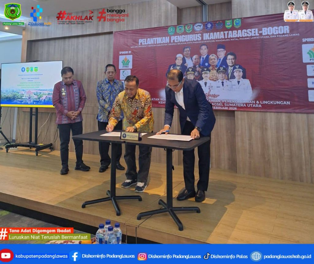 Asisten II Drs Marza Zennova MM, menghadiri acara pelantikan Pengurus Ikatan Alumni Mahasiswa Tapanuli Bagian Selatan (IKAMATABAGSEL) periode 2025-2029 sekaligus penandatanganan (MOU) tentang Pendidikan, Penelitian Dan Pengabdian Kepada Masyarakat antara Pemkab Padang Lawas dengan Rektor Institut Pertanian Bogor (IPB) Jawa Barat. Sabtu 14 Februari 2026.